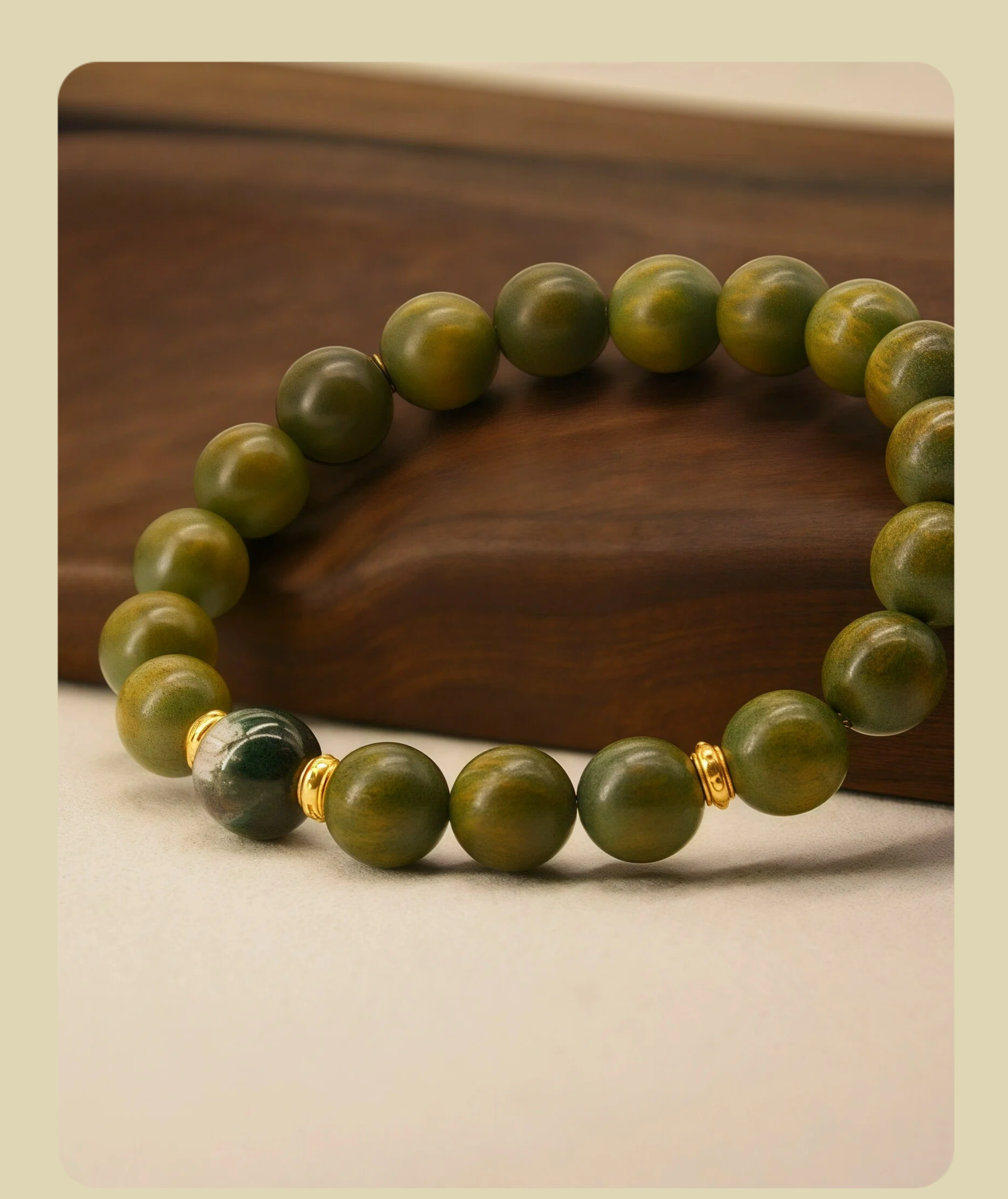 A bracelet made of golden nanmu or green sandalwood, worn daily on your wrist, allows the wood’s natural energy to gently nourish your liver and gallbladder energy. You may find your emotions becoming more balanced, your eyes brighter, and your decisions more confident.