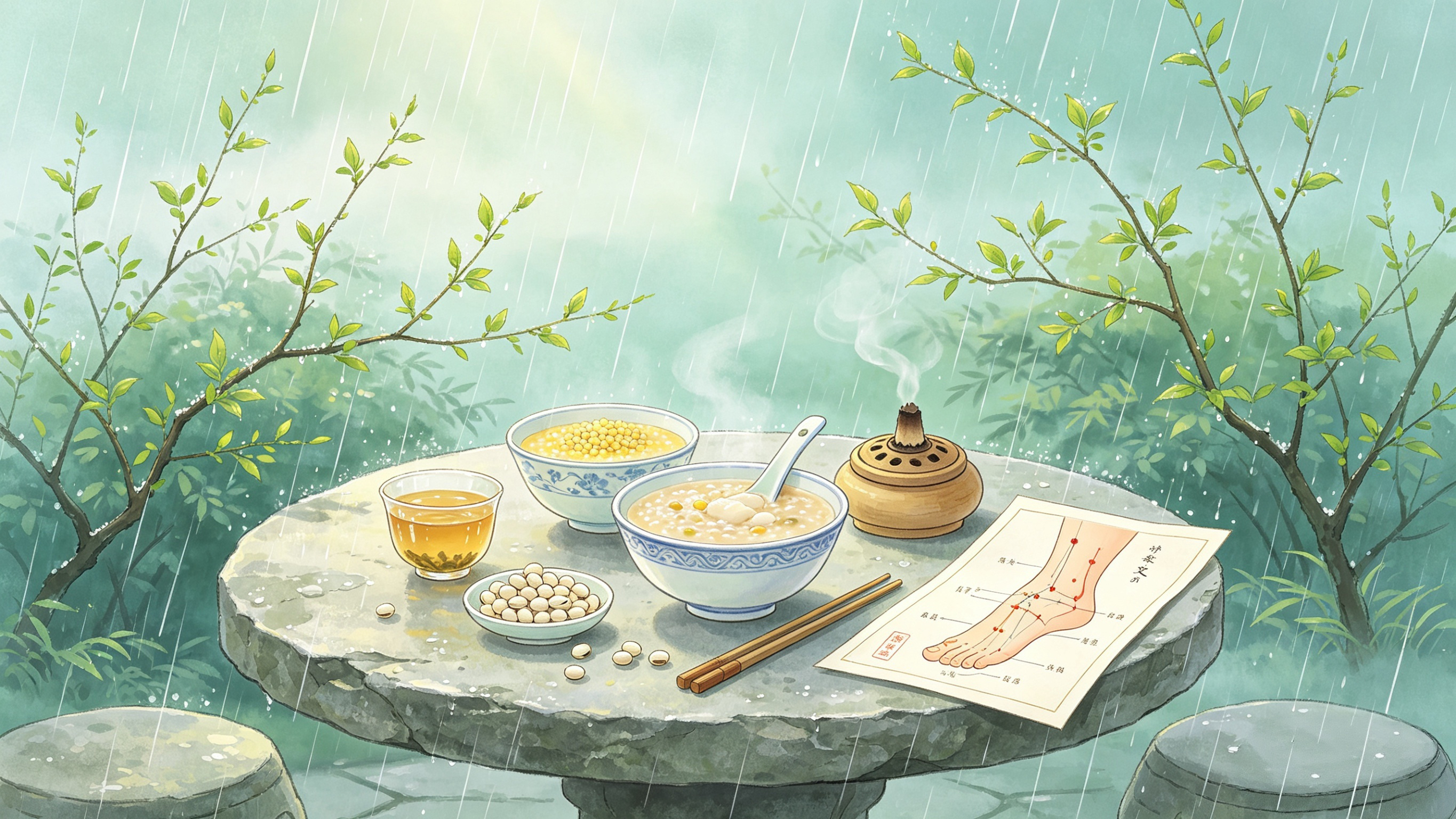 At Grain Rain, the wood qi of spring begins to converge, but the spleen soil has not fully recovered yet. Unfortunately, at this time, there is an increase in rainfall and moisture, which is most likely to trap the spleen. The spleen is already weak, and when it is surrounded by external dampness, typical spleen deficiency and excessive dampness will occur: